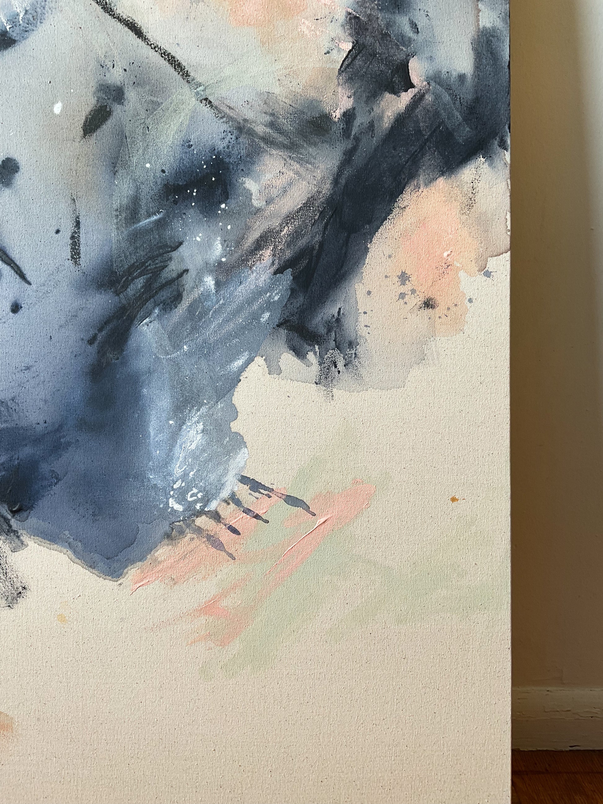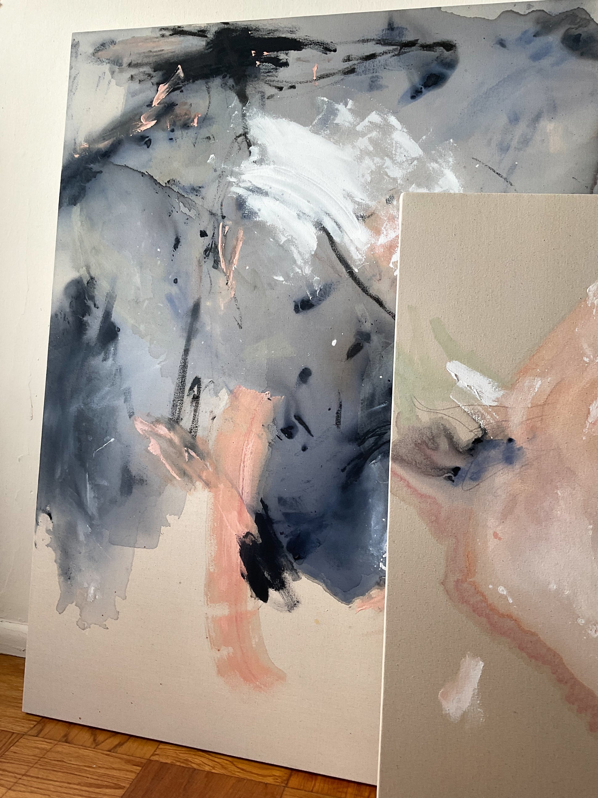 august 2023 i was lucky enough to spend a full month at the beach. rockaway beach nyc. living close to the ocean is always something I thought i wanted in my life, and being at the beach for longer than a 4 day holiday really solidified it for me. salt water and the sounds of waves. important for me moving forward. I had limited painting space but was inspired on the daily and with what I had was able to create a very small collection of 3 paintings inspired by the colors, patterns, and energy of the beach.