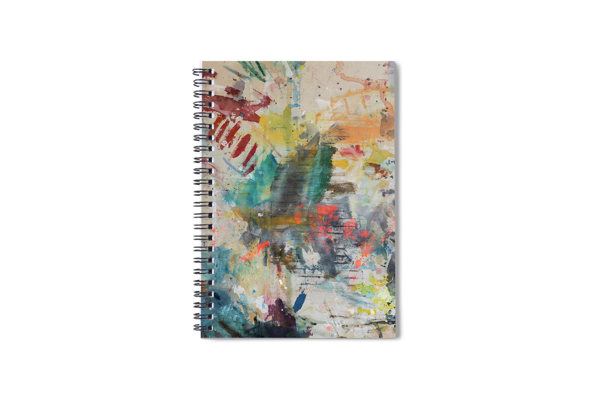 Our spiral notebooks are 6" x 8" in size and include 120 pages which are lined on both sides. The artwork is printed on the front cover which is made of thick paper stock, and the back cover is medium gray in color. The inside of the back cover includes a pocket for storing extra paper and pens.