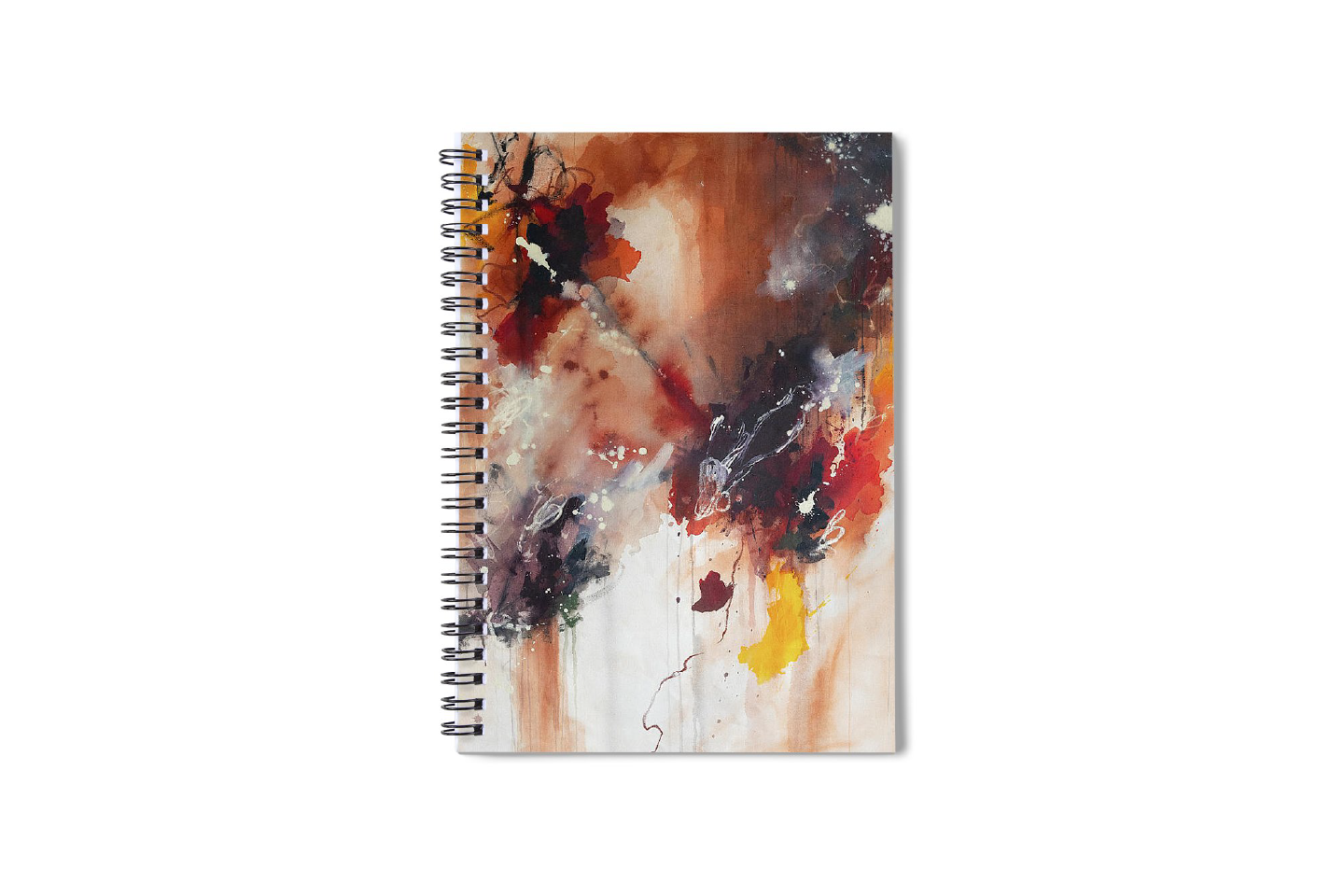 Our spiral notebooks are 6" x 8" in size and include 120 pages which are lined on both sides. The artwork is printed on the front cover which is made of thick paper stock, and the back cover is medium gray in color. The inside of the back cover includes a pocket for storing extra paper and pens.